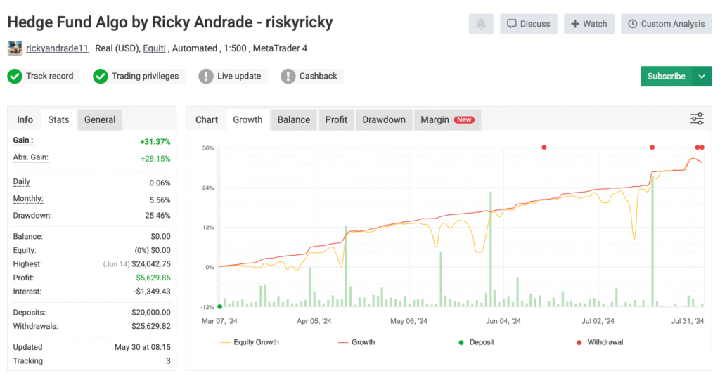 The Hedge Fund Algo EA is an automated trading system running on MetaTrader 4 (MT4) with 1:500 leverage, hosted on a real Equiti account. It showcases a strong blend of consistent growth and risk management. Below is the in-depth analysis of its key performance metrics: